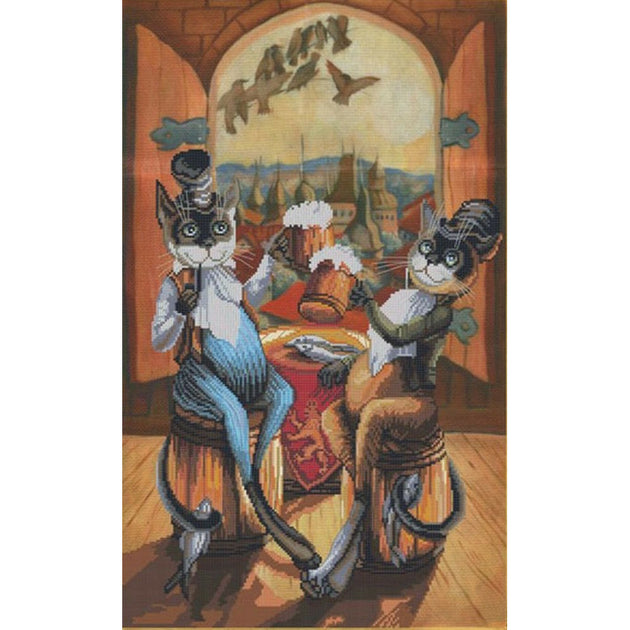 sur toile Aïda 6.4 points au cm. Broderie partielle sur un fond imprimé : seuls les motifs de premier plan sont brodés au point de croix compté d'après le diagramme fourni.