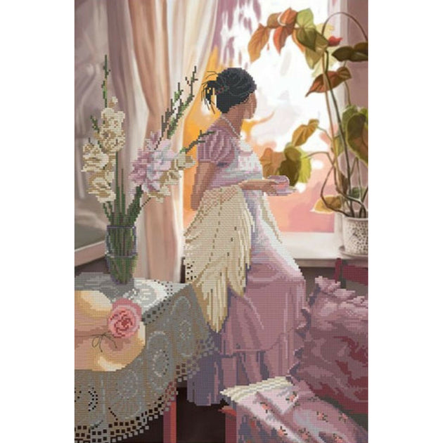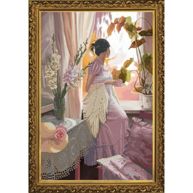 sur toile Aïda 5.4 points au cm. Broderie partielle sur un fond imprimé : seuls les motifs de premier plan sont brodés au point de croix compté d'après le diagramme fourni.