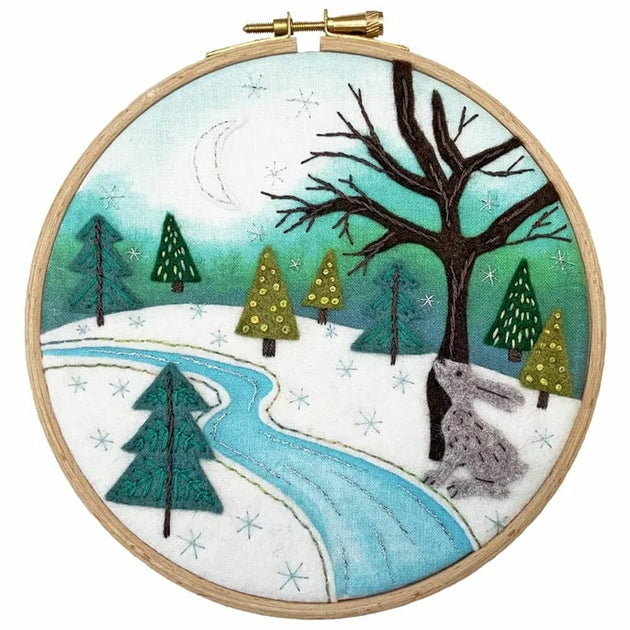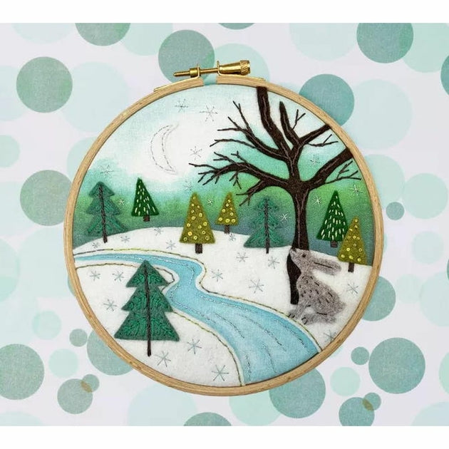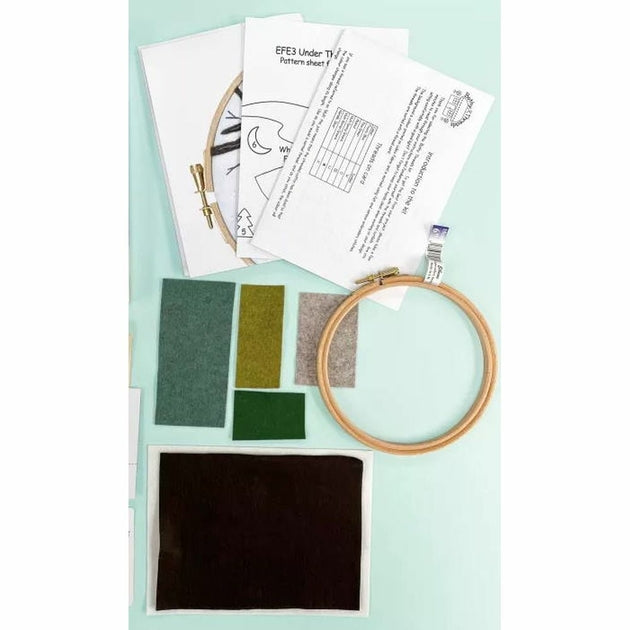 Kit de broderie feutrine à réaliser avec plusieurs points, point droit, point plumetis, point tige, point Y, point arrière, point de nœud, sur une toile coton calicot imprimé en couleurs, les fils coton mouliné, fils métallisé triés sur carte, feutrine, un tambour bois .