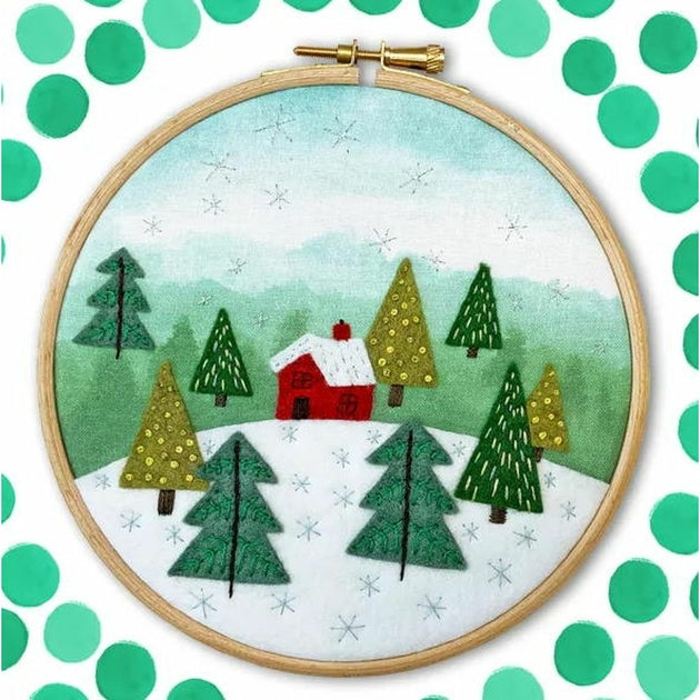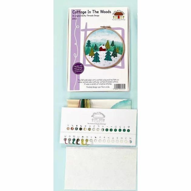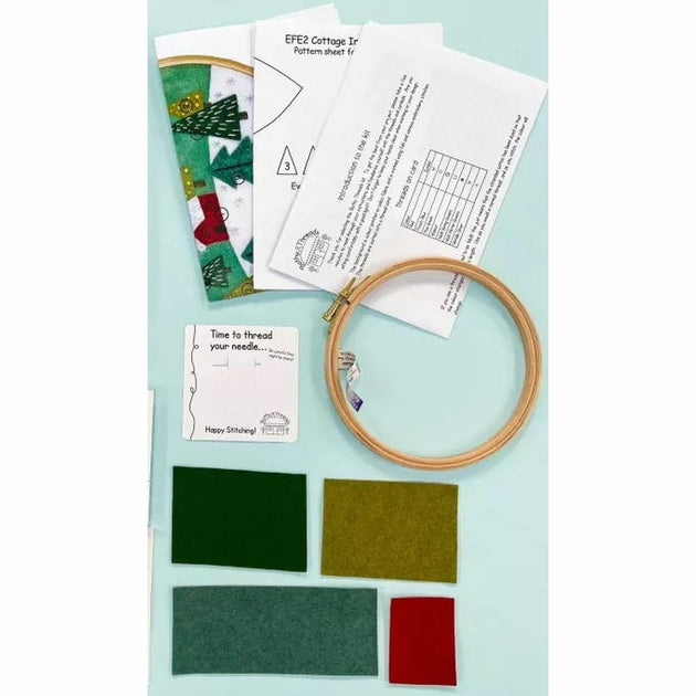 Kit de broderie feutrine à réaliser avec plusieurs points, point droit, point plumetis, point tige, point Y, point de nœud, sur une toile coton calicot imprimé en couleurs, les fils coton mouliné, fils métallisé triés sur carte, feutrine, un tambour bois .
