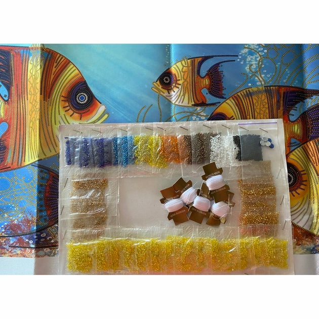 Kit de Broderie avec perles, à réaliser au point de piqûre, sur une toile satin imprimé en couleurs, les perles Slovenska Busa 9 couleurs, 5 sequins, conditionnées dans des sachets transparents, avec leurs numéro correspondant indiqué sur le coté de la toile, fil blanc pour coudre les perles, une aiguille, notice explicative, Dimensions du modèle terminé : 65 x 30 cm .