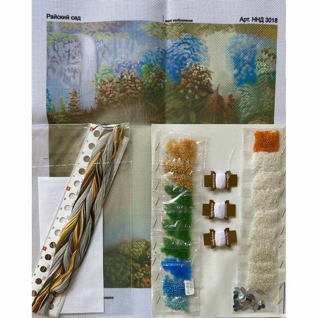 Kit de broderie à réaliser au point de croix compté, avec les perles Slovenska Busa 9 couleurs dans des sachets transparents, avec sequins 4 variétés, sur une toile Aida imprimé 5.4 points au cm, fils à broder (Palmira 180) 14 couleurs triés sur carte, (le dessin n'est pas imprimé sur la toile), diagramme en couleurs avec explications, Dimensions de l'ouvrage terminé : 30 x 36 cm.