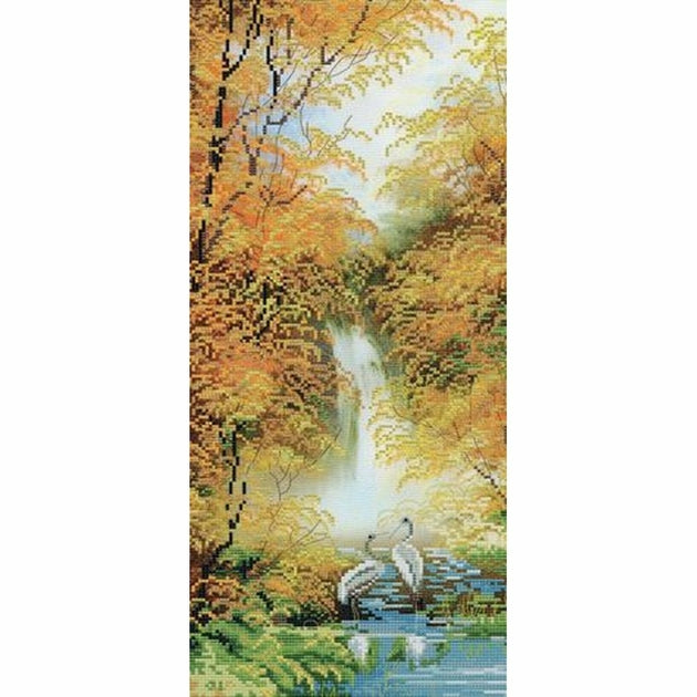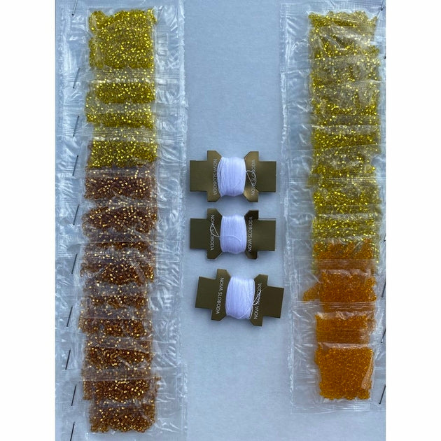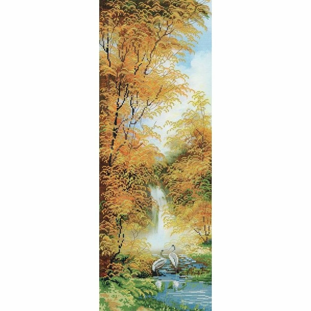 Kit de broderie à réaliser au point de croix compté, avec les perles Preciosa 4 couleurs conditionnées dans des sachets transparents, sur une toile Aida imprimé 5.4 points au cm, les fils à broder Anchor 20 couleurs triés sur carte, (le dessin n'est pas imprimé sur la toile), diagramme en couleurs avec explications, Dimensions de l'ouvrage terminé : 20 x 62 cm.