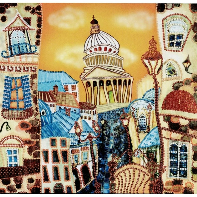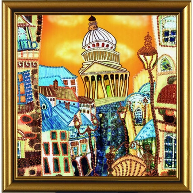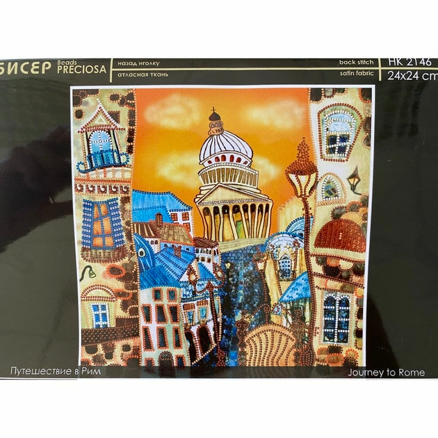 Kit de broderie avec des perles, à réaliser au point de piqûre, sur une toile satin imprimé en couleurs, les perles Preciosa 7 couleurs conditionnées dans des sachets transparent, avec leurs numéro correspondant indiqué sur le coté de la toile, fil blanc pour coudre les perles, aiguille, notice explicative, Dimensions du moèle terminé : 24 x 24 cm .