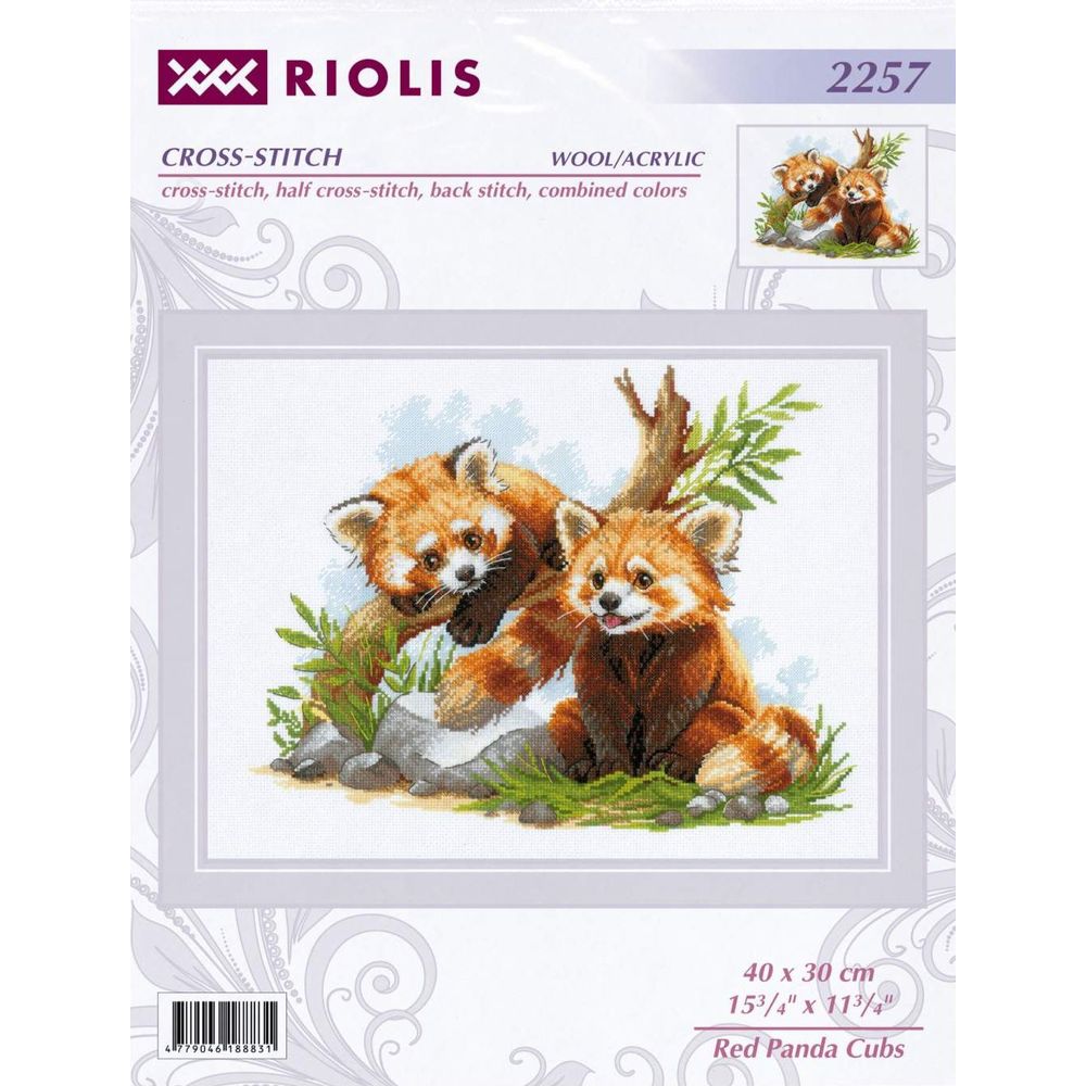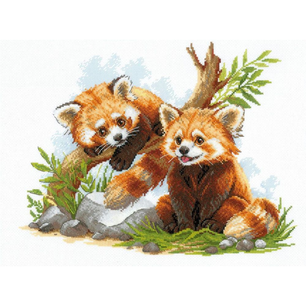 Ce kit au point de croix RIOLIS 2257 représente deux adorables petits pandas roux, l'un dans l'herbe et l'autre grimpant à une branche. Le motif capture toute la douceur de la forêt. Idéal pour les amoureux des animaux, ce kit apportera la beauté de la faune sauvage à votre collection de broderies.