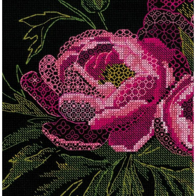 Kit de broderie Blackwork à réaliser au point de croix compté, point gobelin, sur une toile zweigart Aida noir 5.4 points au cm, les fils Anchor 7 couleurs triés sur carte (le dessin n'est pas imprimé sur la toile) suivant le diagramme, explications fournie , Dimensions du modèle terminé : 30 x 24 cm,