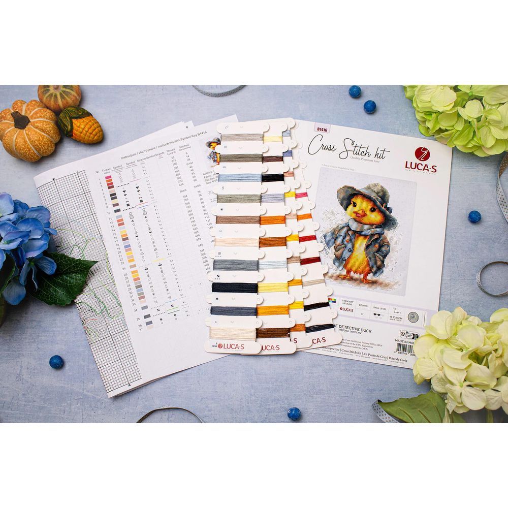 Kit de broderie à réaliser au point de croix compté,  demi point de croix,  sur une toile zweigart Aida blanche avec petit pois bleu 5.4 points au cm,  les fils de luca-S coton mouliné 37 couleurs triés sur carte,  (le dessin n'est pas imprimé sur la toile),  diagramme en noir et blanc,  aiguille à broder,  explications,  Dimensions de l'ouvrage terminé : 15 x 18 cm .